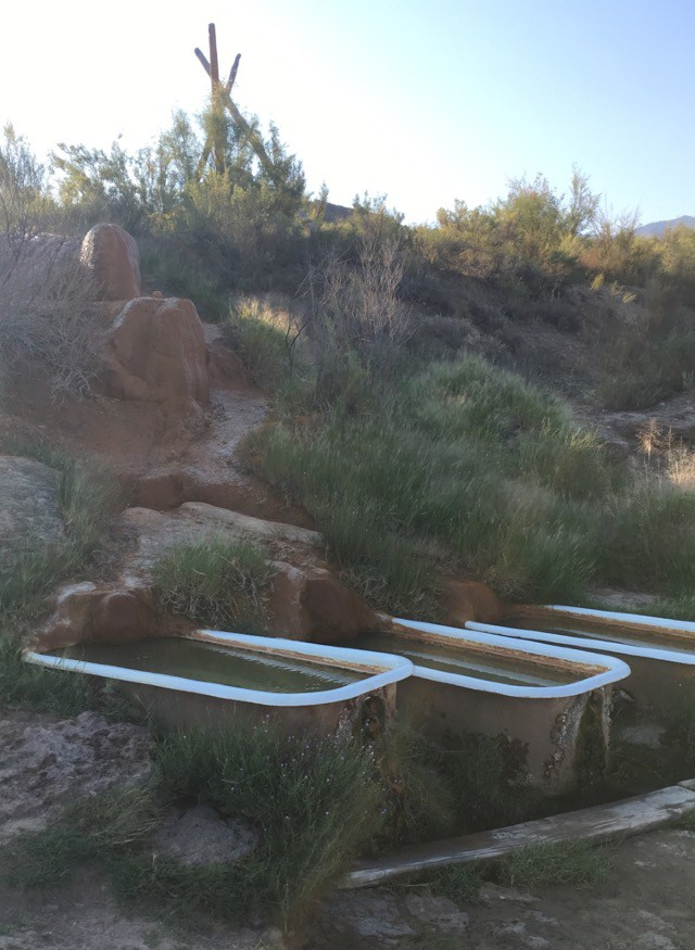 After unpacking our things we headed for the hot springs. The natural springs ran down a hill, fed into three bathtubs on the upper level (yes, outdoor bathtubs), and all emptied out into a large pool down below.