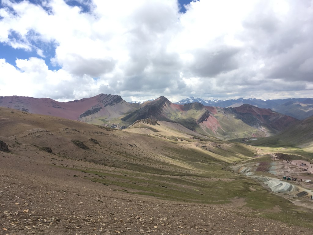 Finally, we reached the start of the Rainbow Mountain hike. Various minerals result in the seven, somewhat unexpected colors that can be seen in the peaks, and give the range its name. For most of the range, you can see maybe one or two, or even a handful of the seven colors, but not all. Vinicunca, the Montaña de Siete Colores, the famous peak and popular tourist attraction, is the only mountain in the range that exhibits all seven colors quite brilliantly.
