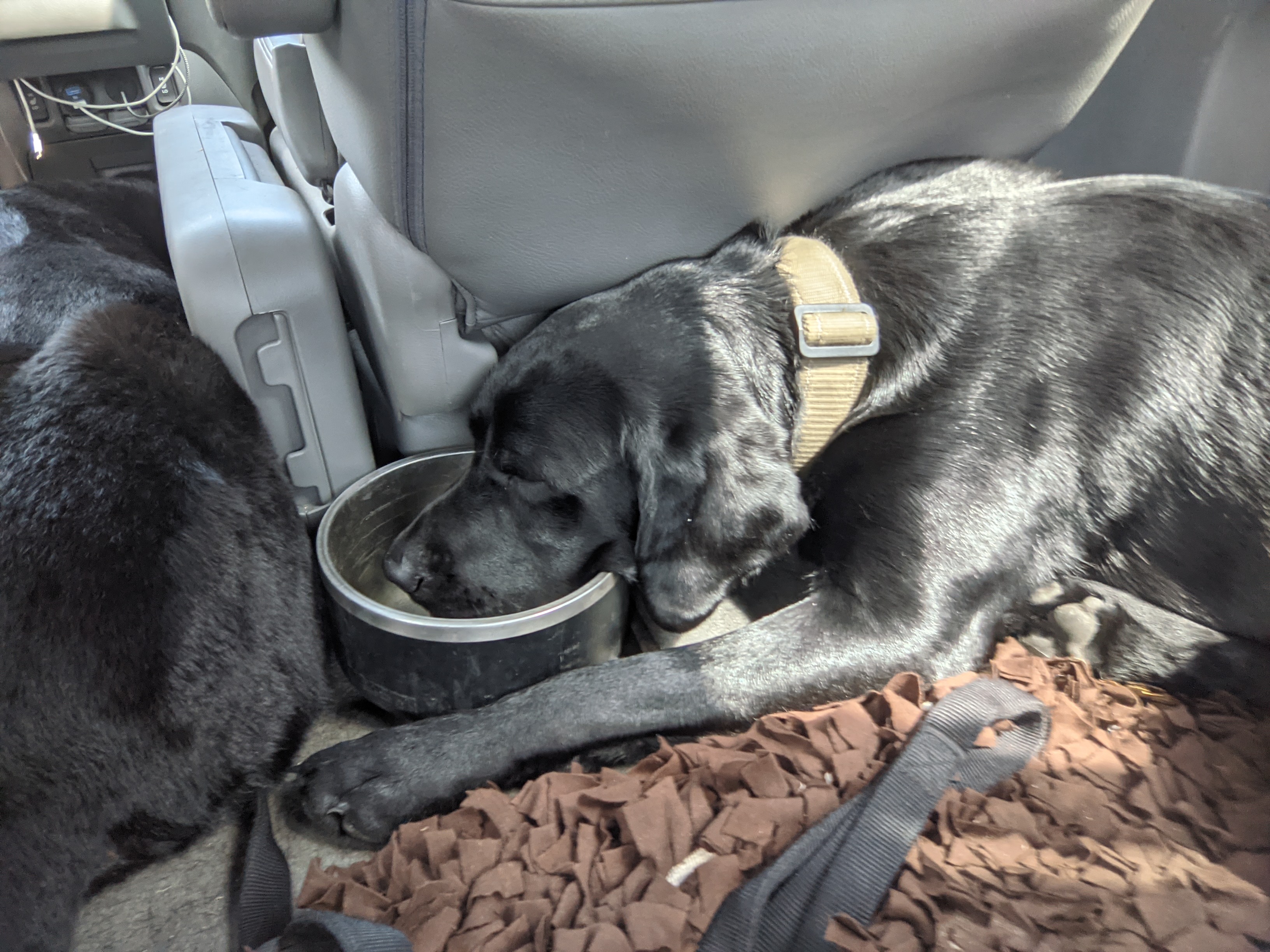 The boys were so tired from the camping adventure that Darrell fell asleep in his water bowl on the ride home.